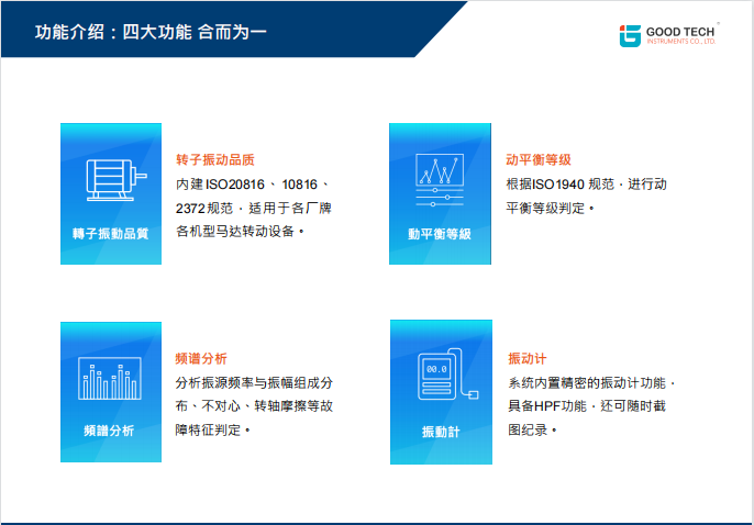 功能上,包含ISO 1940动平衡演算法,ISO 20816 转子品质,时域频域图像,3种振动量测模式,设备状态无死角。