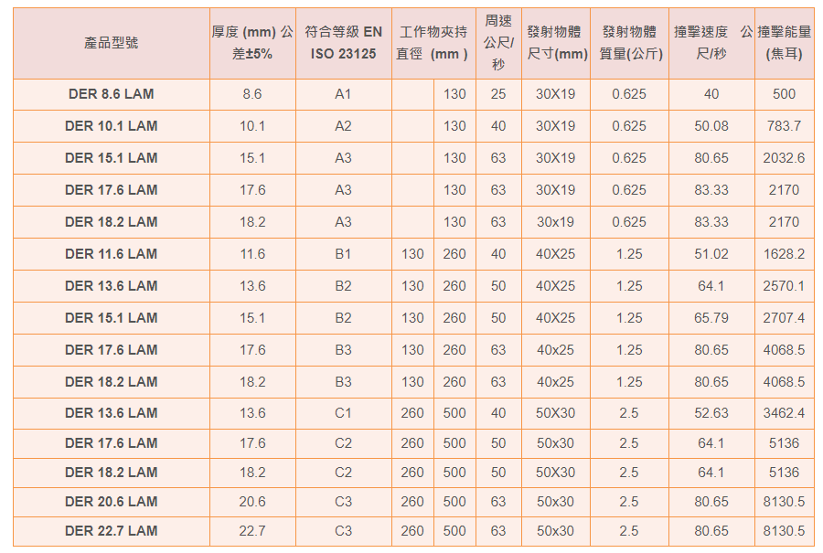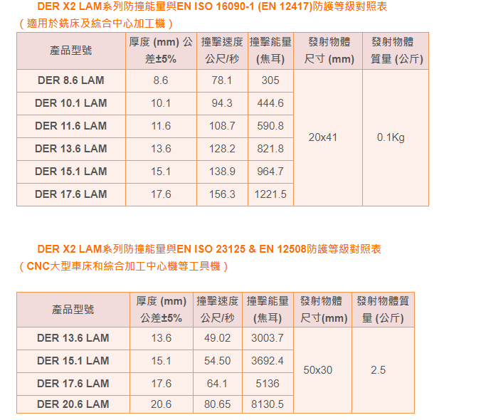 DER X2 LAM系列防撞能量與EN ISO 16090-1 (EN 12417)防護等級對照表